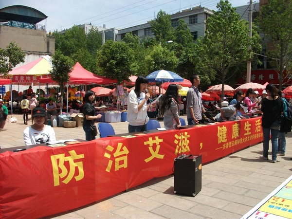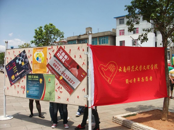 为进一步宣传普及艾滋病预防知识,降低对艾滋病感染者的歧视,倡导大家关怀帮助艾滋病病毒感染者,提高全社会对防治工作的认识,向居民宣传艾滋病有关知识,提高居民预防爱滋病的意识,扩大爱滋病知晓范围,促进社会和谐发展。2012年4月21日,云南师范大学文理学院“同心”青年志愿者协会在昆明市嵩明县商业中心城开展了以“防治艾滋病,健康生活每一天”为主题的宣传及咨询活动。