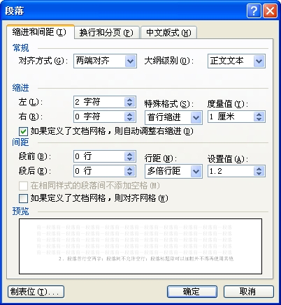 3.行间距:多倍行距,设值1.2。