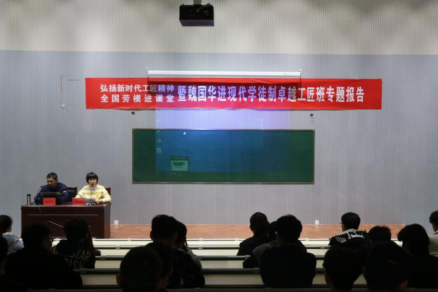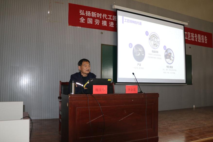 为贯彻落实《国家职业教育改革实施方案》,学习大国工匠精神,创新创业领军人才,培养并传承工匠精神,PP电子PP电子游戏网站特邀全国劳模魏国华先生,于2021年3月25日在6号教学楼108室为师生开展了一场以“弘扬新时代工匠精神”为主题的报告会。参加会议人员有PP电子游戏网站院长安丰金、副院长李金花,以及部分老师代表学生代表等200余人参加了此次报告会,报告会由副院长李金花主持。