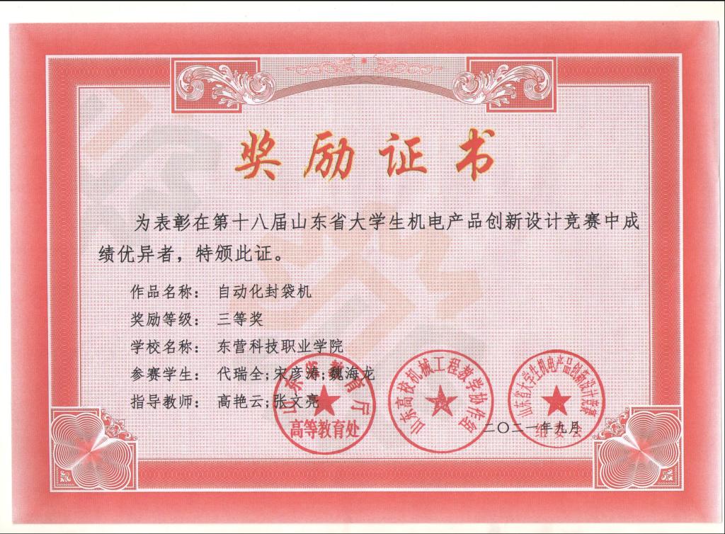 近日,第十八届(2021年)山东省大学生机电产品创新设计竞赛决赛成功举行。PP电子PP电子游戏网站学生代瑞全、宋彦涛、魏海龙的团队作品《自动化封袋机》荣获三等奖。